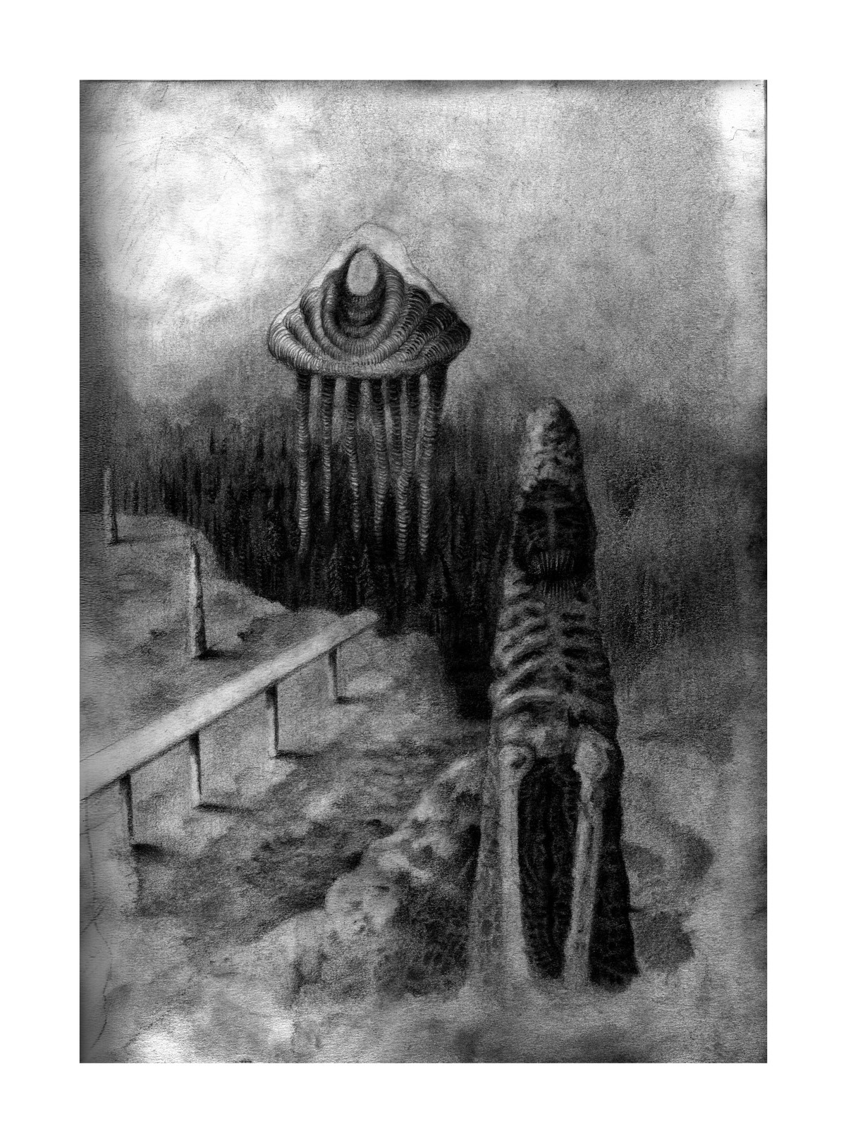 "Strange creatures in the distance, floating calmly on the yellow and faint line of the horizon."
